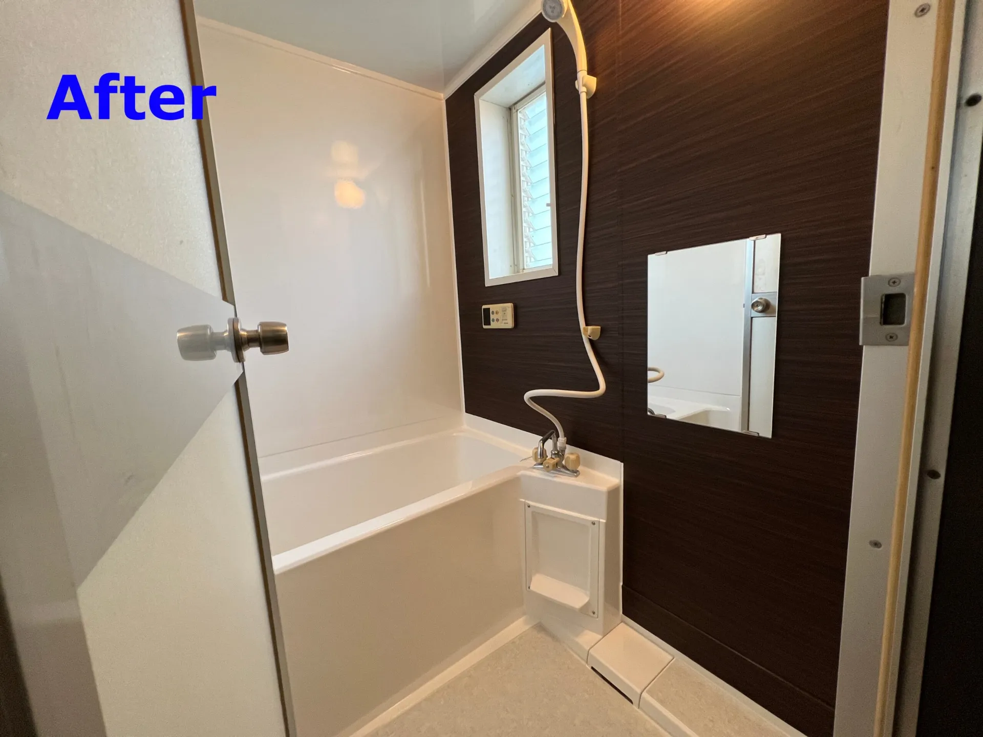 今回提案する浴室リフォーム(ヌリ・ハリリフォーム)・・・ユニットバスの場合、家を保護する養生は同じく必要ですが、必要最低限の部品を外し、塗装やパネルを貼る部分の下地調整(清掃や脱脂・パテ補修・研磨など)の後、塗装・パネル貼り・床シート(ヒートショック対応)貼りなどご契約に合わせた工程で完了します。相場は30万円前後 ※サイズや既存の浴室により異なります